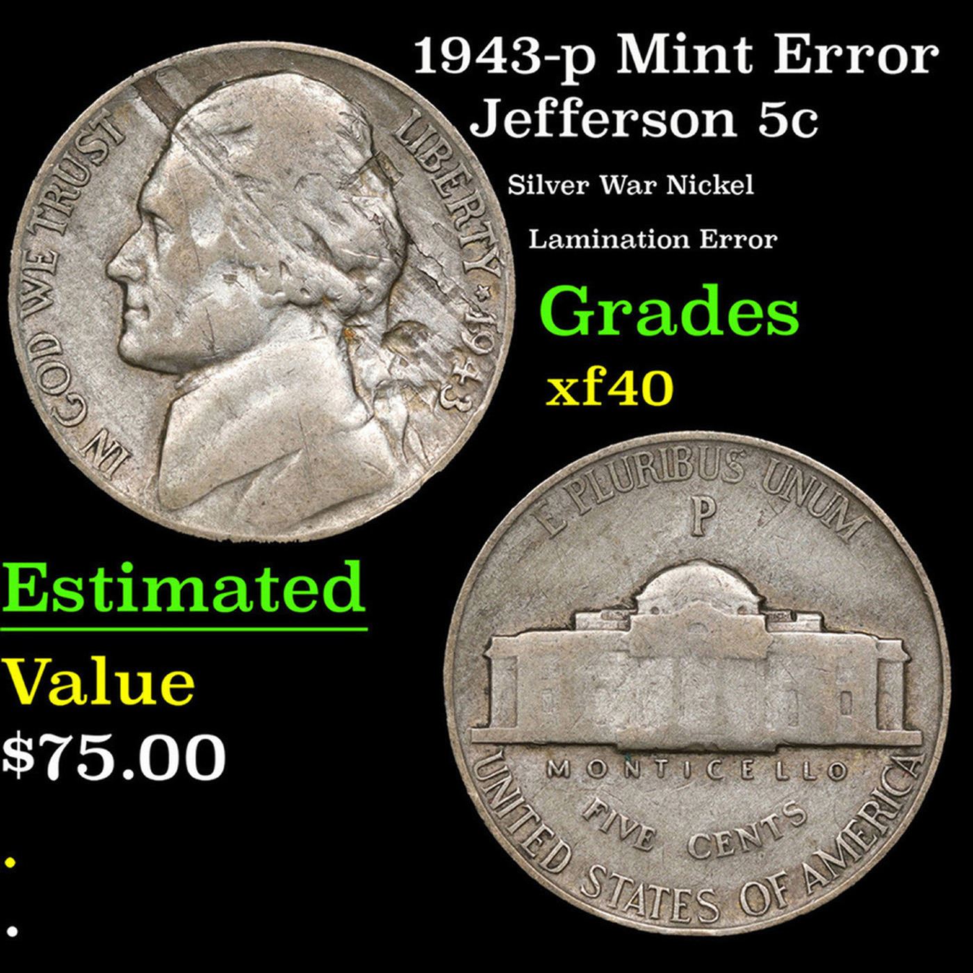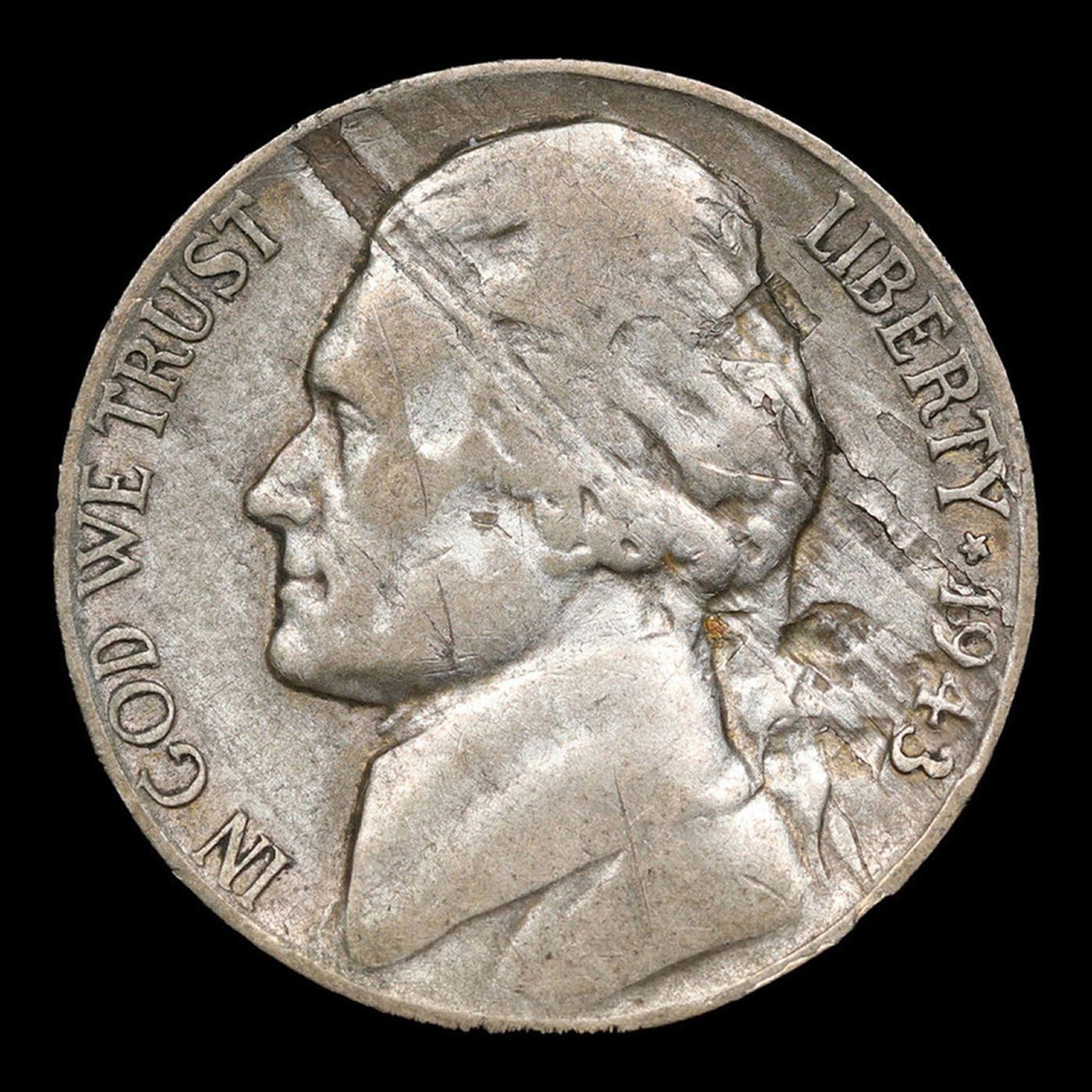 1943-p Mint Error Jefferson Nickel 5c Grades xf.