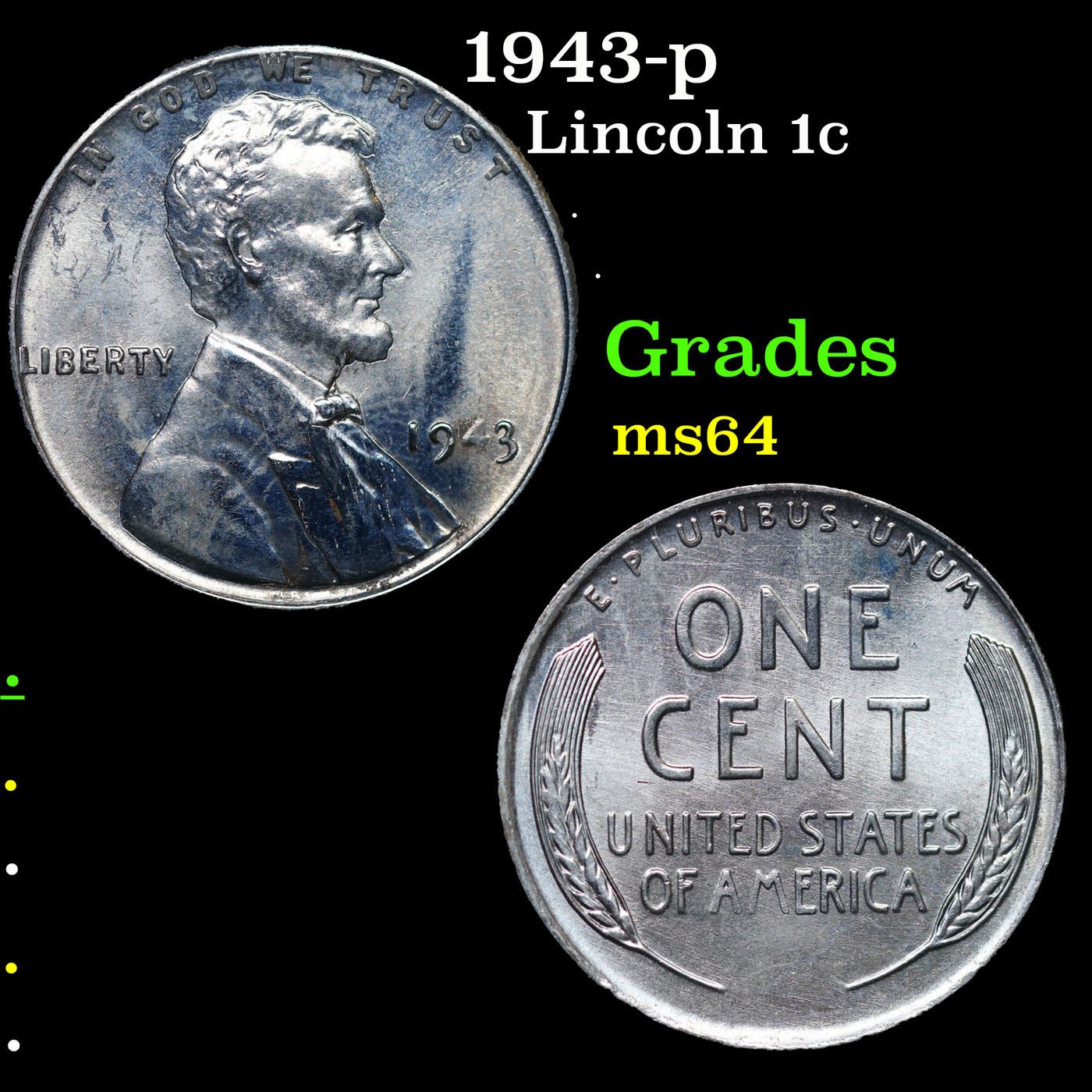 1943-p Lincoln Cent 1c Grades Choice Unc. One year type coin. The much heralded, "Steel" WWII cent. Great example of a favorite coin. The 1943-p Wartime issue Steel Cent.