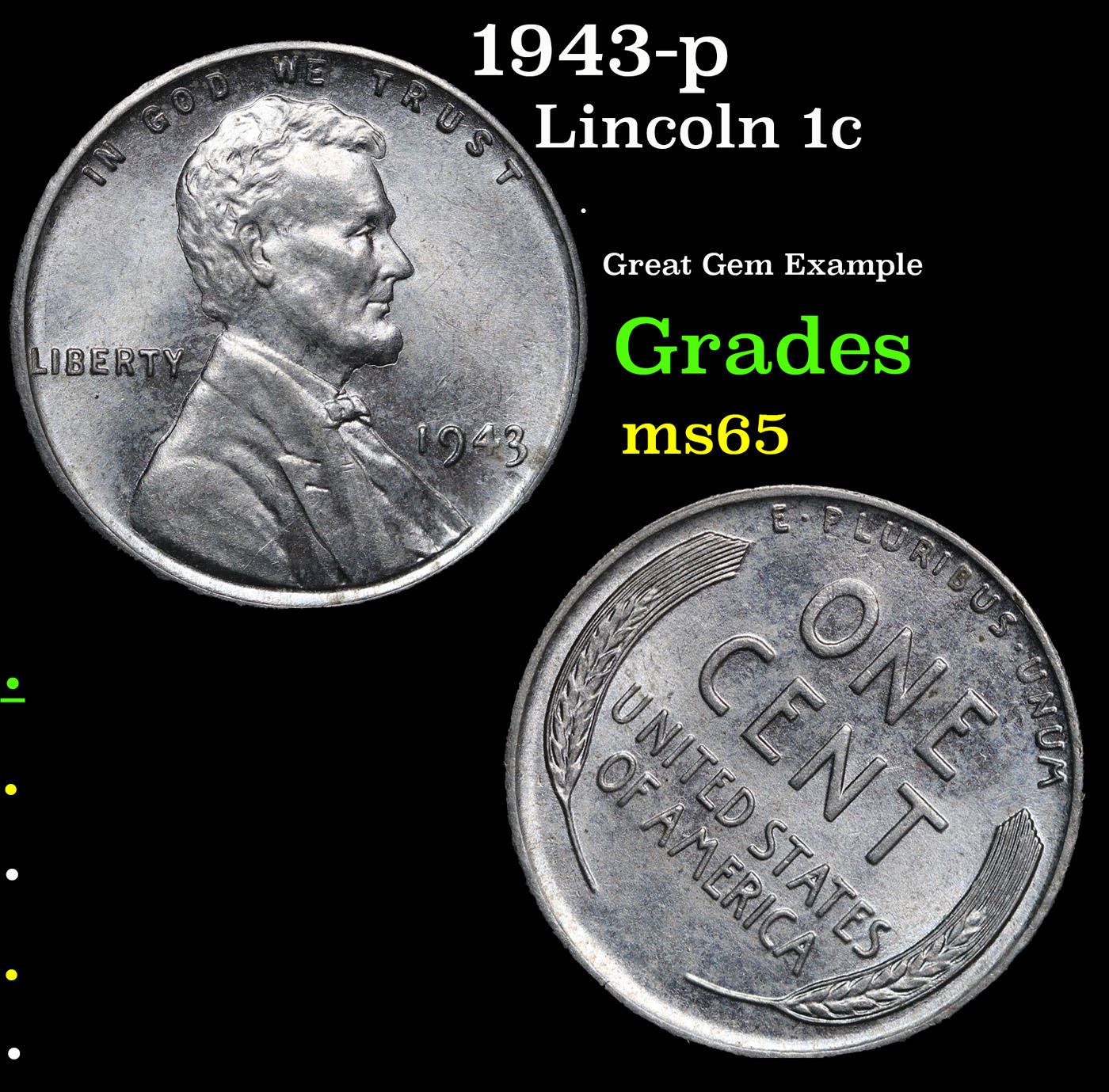 1943-p Lincoln Cent 1c Grades GEM Unc. One year type coin. The much heralded, "Steel" WWII cent. Great example of a favorite coin. The 1943-p Wartime issue Steel Cent.
