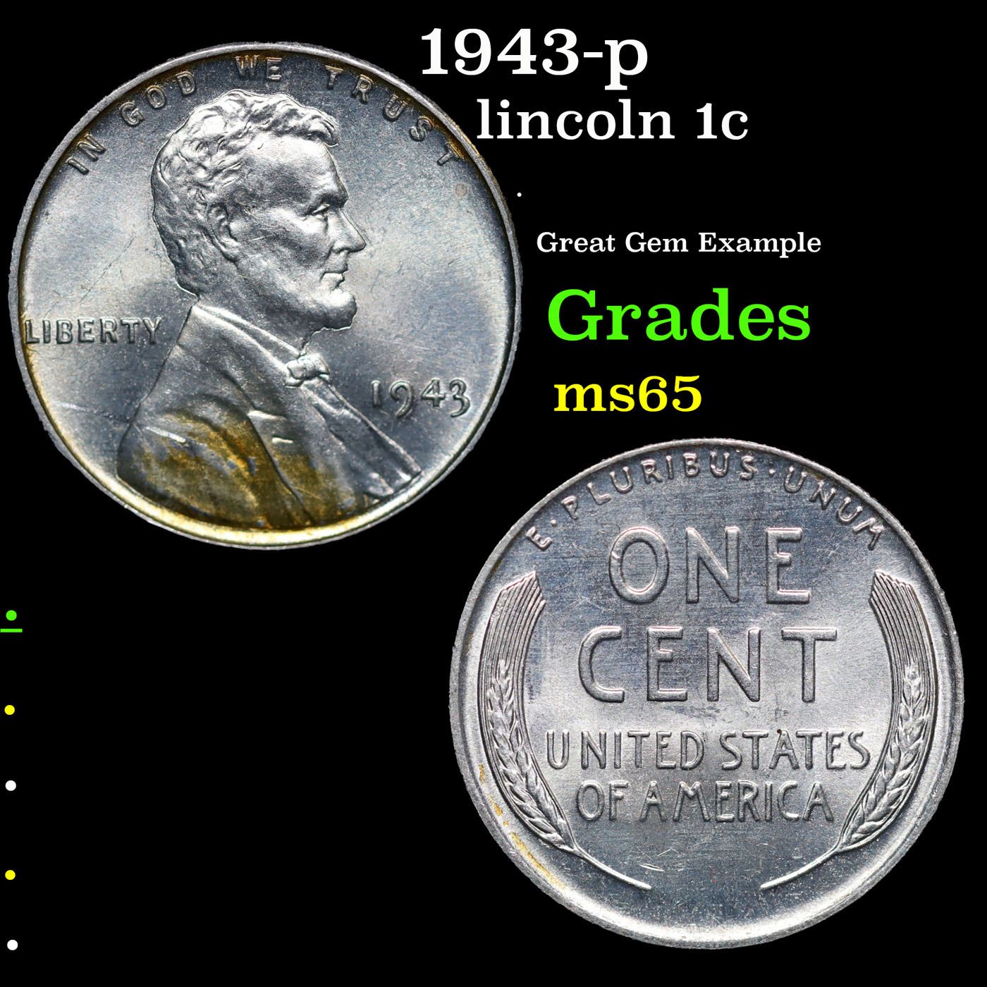 1943-p Lincoln Cent 1c Grades GEM Unc. One year type coin. The much heralded, "Steel" WWII cent. Great example of a favorite coin. The 1943-p Wartime issue Steel Cent.