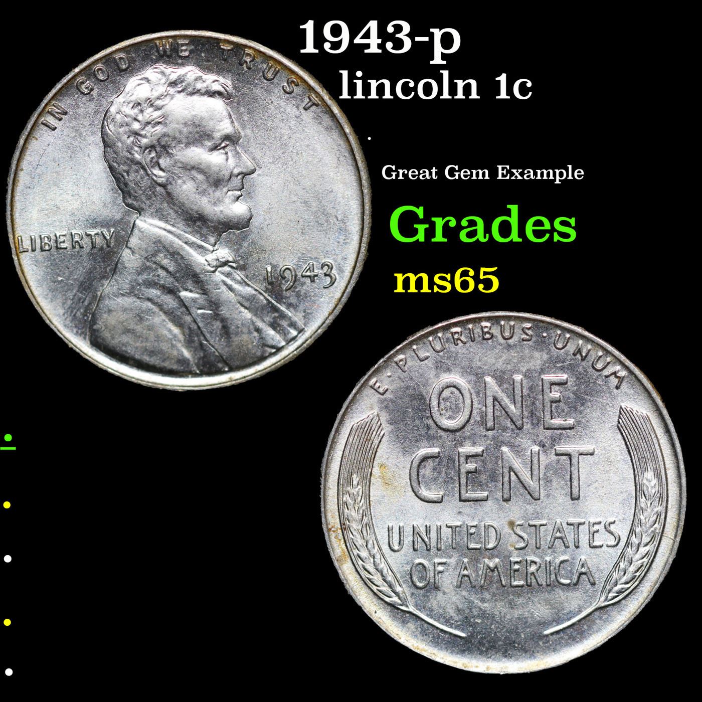 1943-p Lincoln Cent 1c Grades GEM Unc. One year type coin. The much heralded, "Steel" WWII cent. Great example of a favorite coin. The 1943-p Wartime issue Steel Cent.