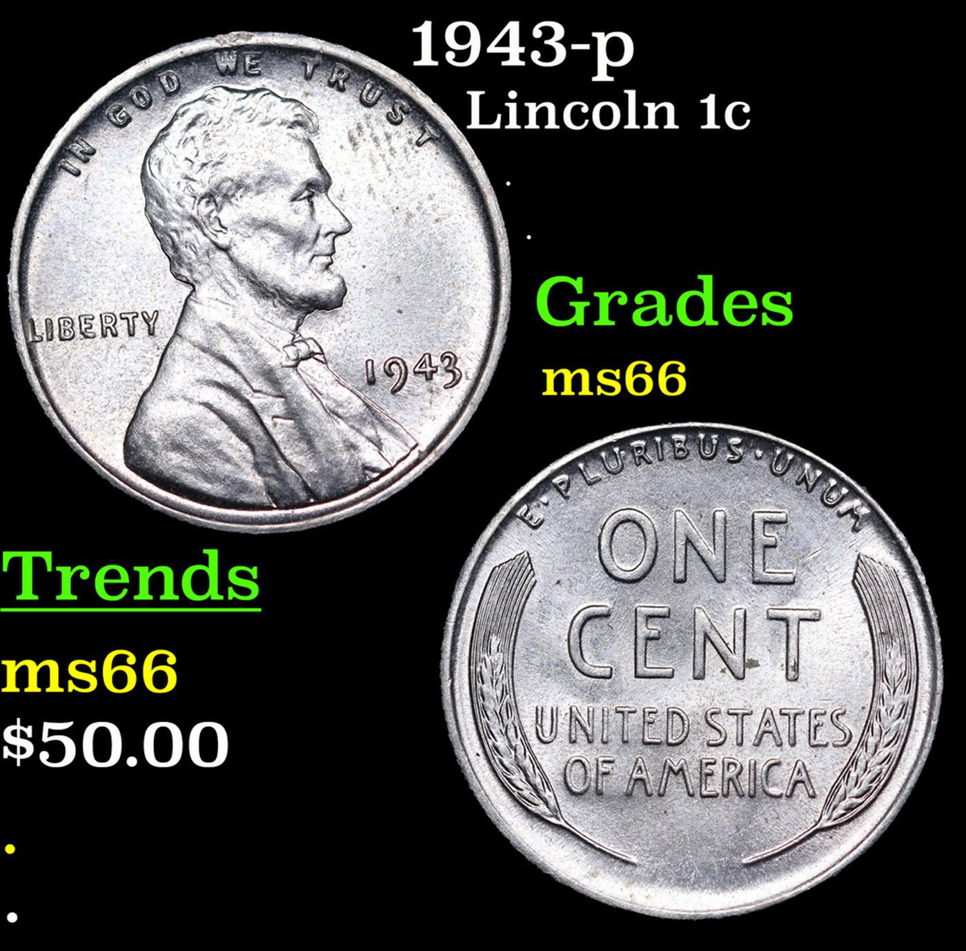 1943-p Lincoln Cent 1c Grades GEM+ Unc. One year type coin. The much heralded, "Steel" WWII cent. Great example of a favorite coin. The 1943-p Wartime issue Steel Cent.