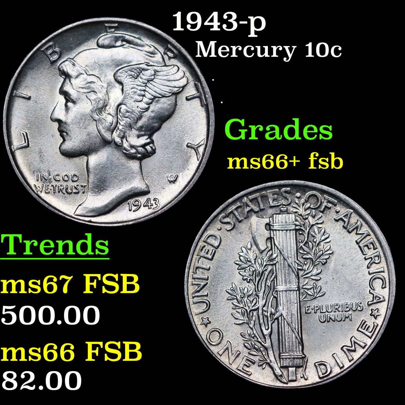 1943-p Mercury Dime 10c Grades GEM++ FSB.