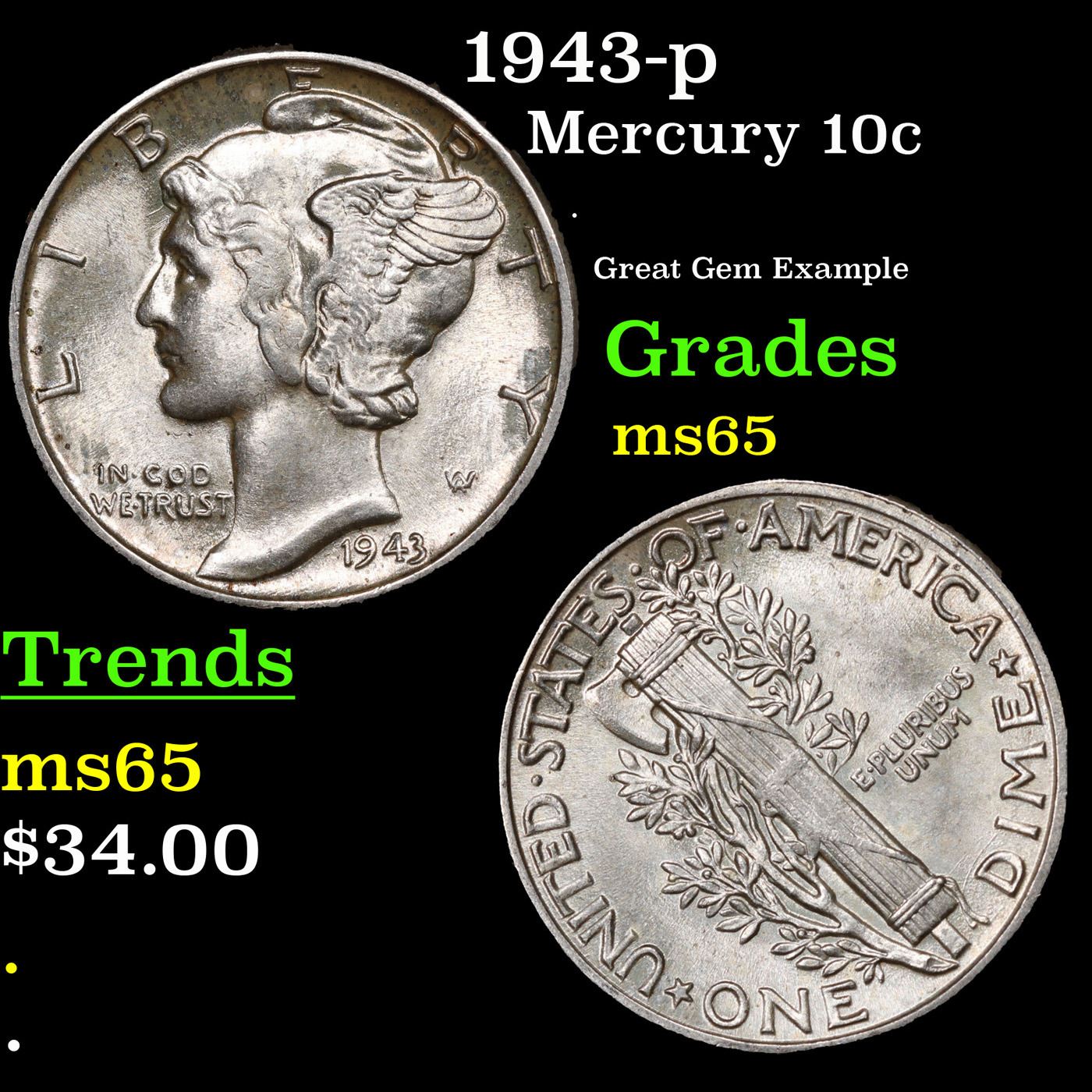 1943-p Mercury Dime 10c Grades GEM Unc.
