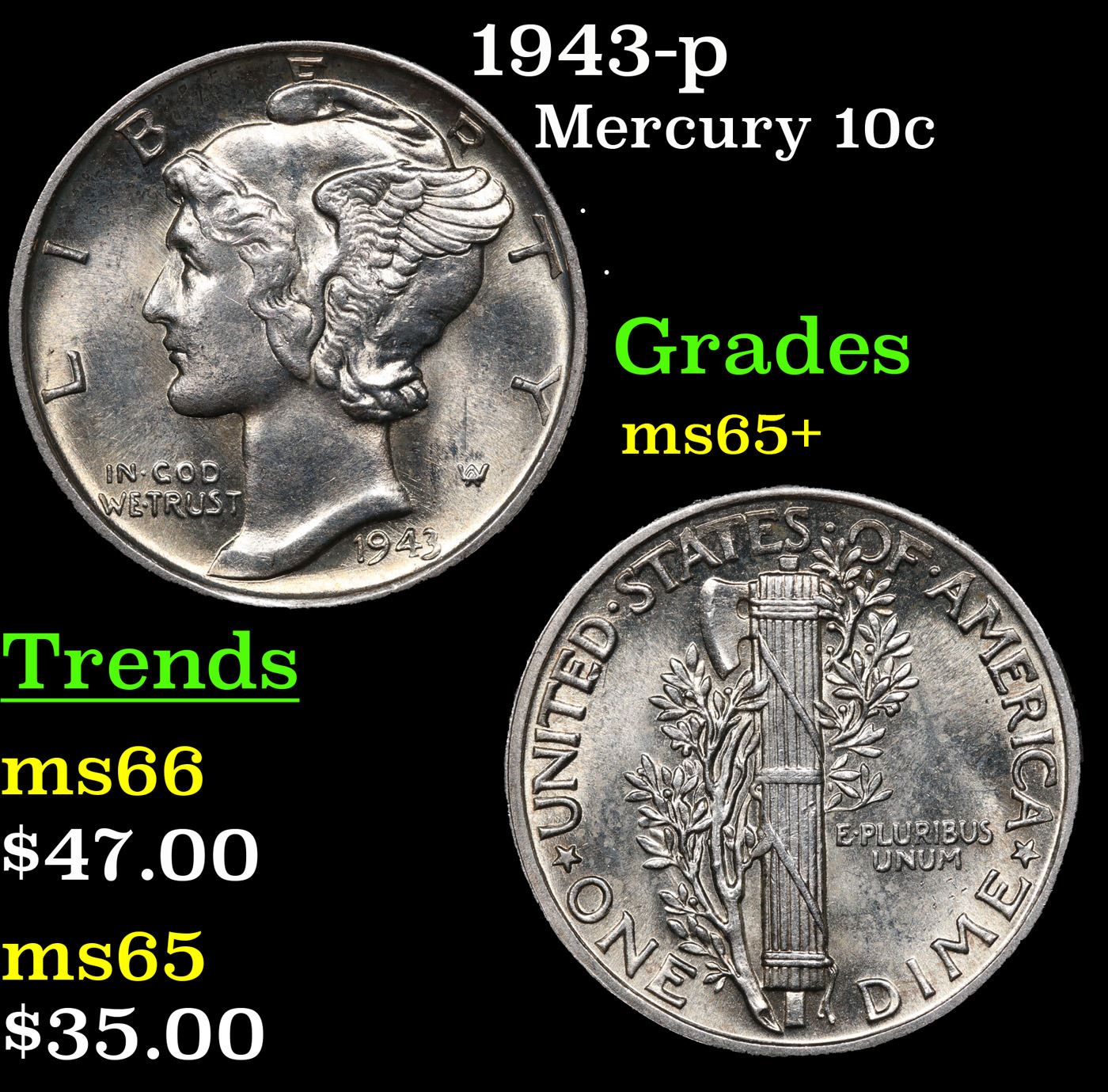 1943-p Mercury Dime 10c Grades GEM+ Unc