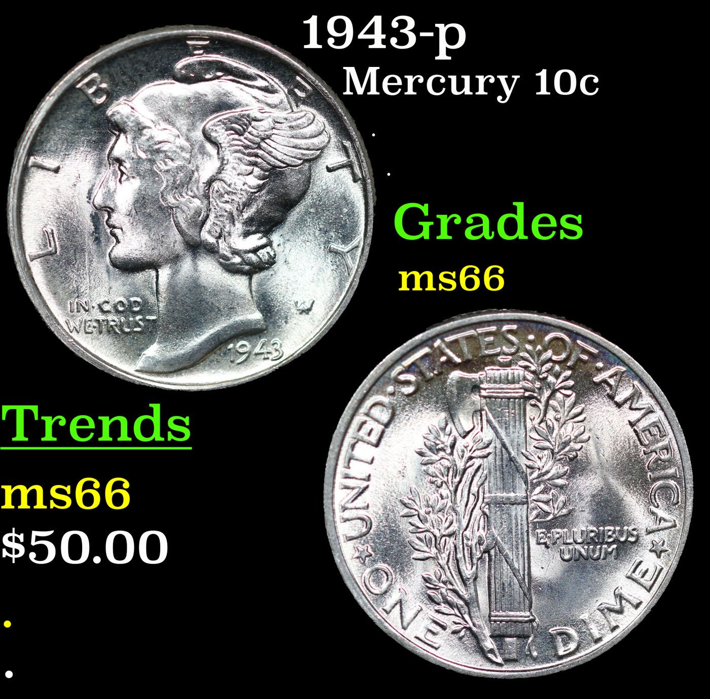 1943-p Mercury Dime 10c Grades GEM+ Unc.