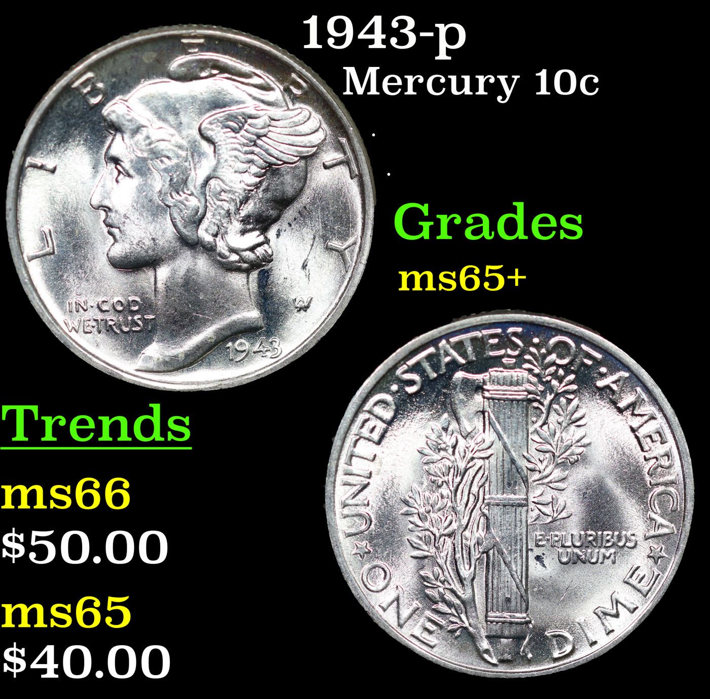 1943-p Mercury Dime 10c Grades GEM+ Unc.