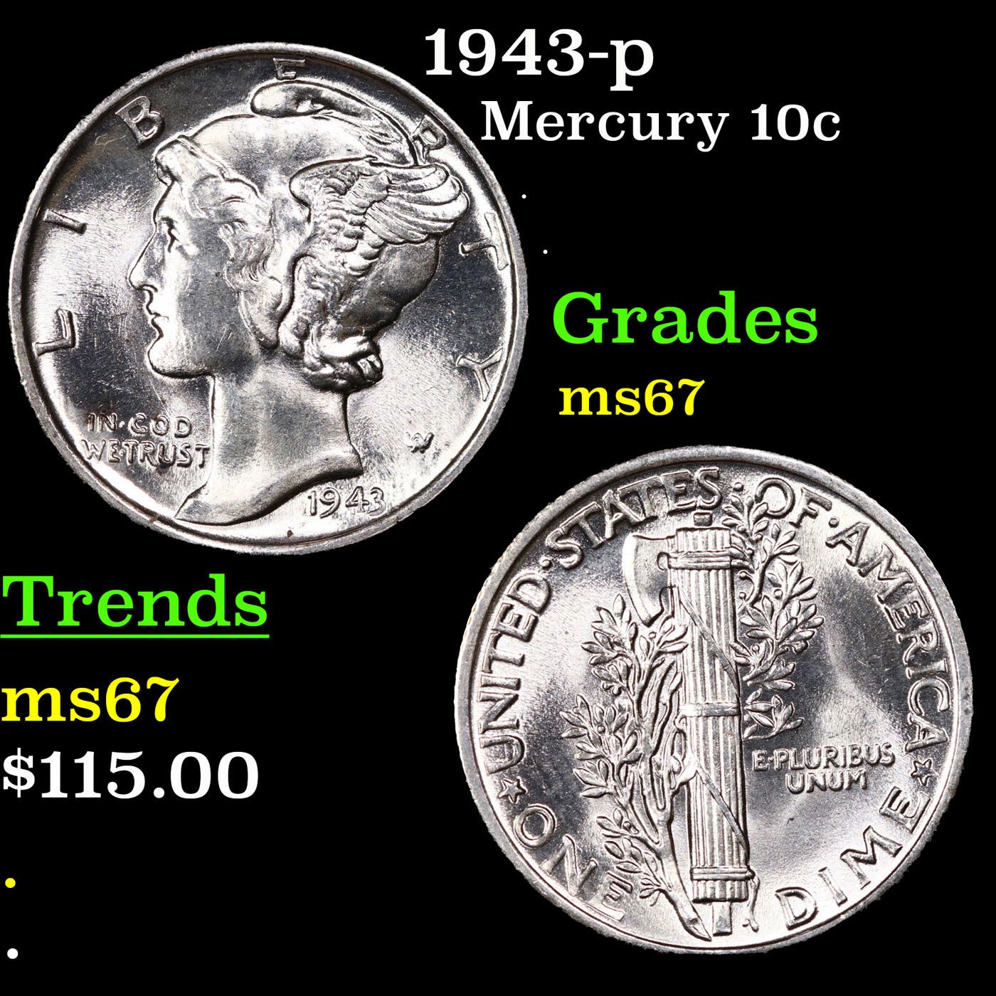 1943-p Mercury Dime 10c Grades GEM++ Unc