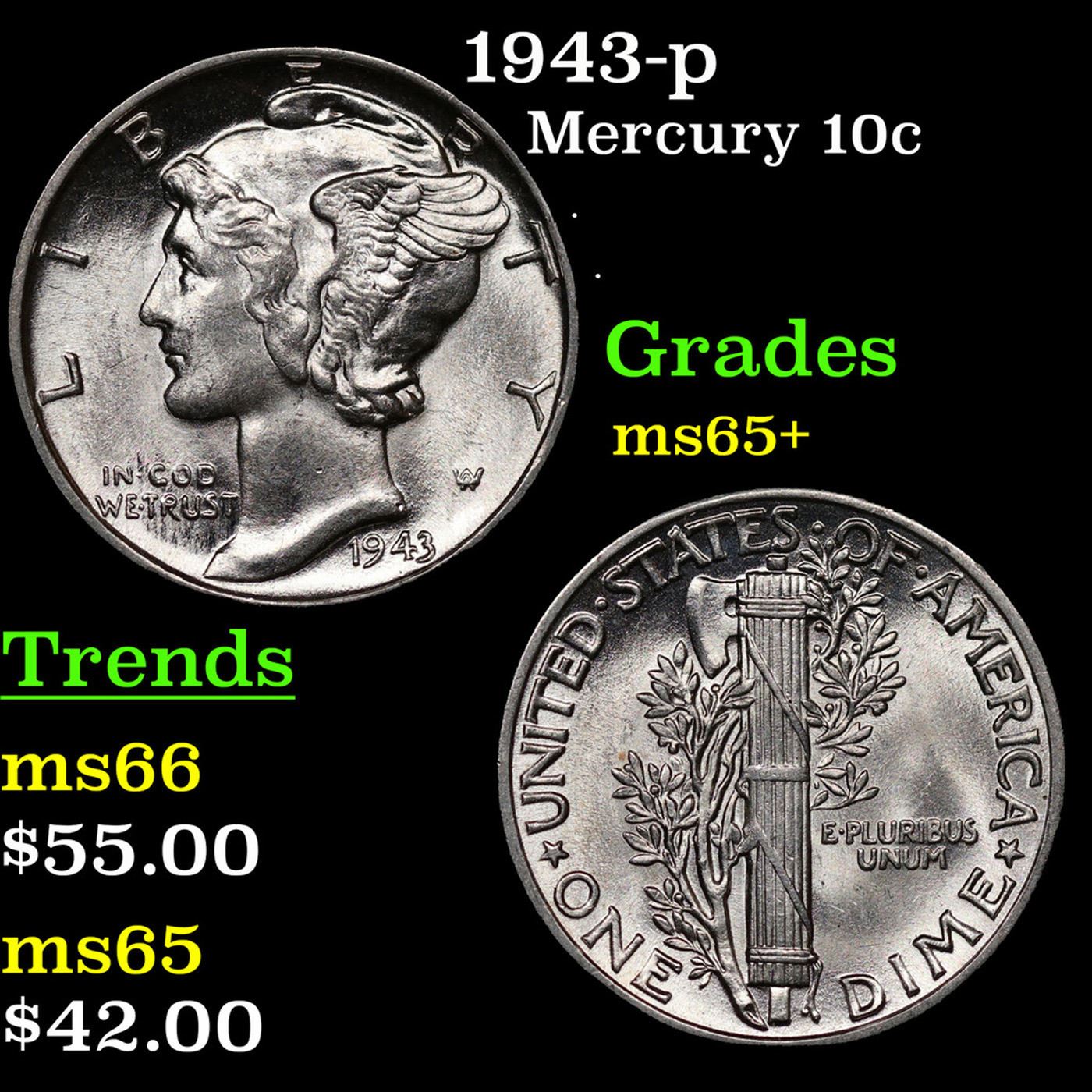 1943-p Mercury Dime 10c Grades GEM+ Unc.
