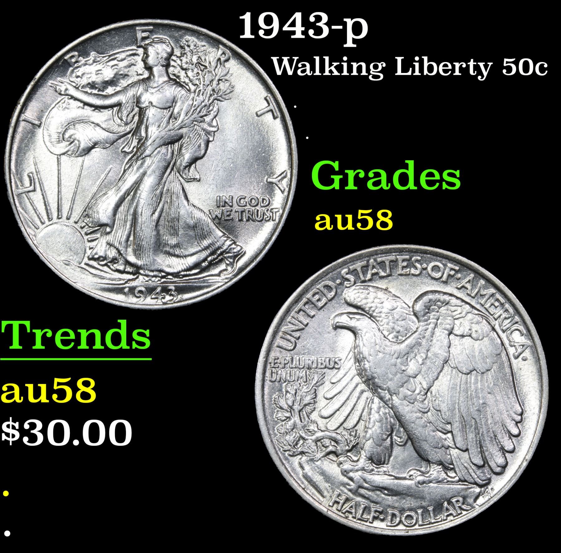 1943-p Walking Liberty Half Dollar 50c Grades Choice AU/BU Slider.