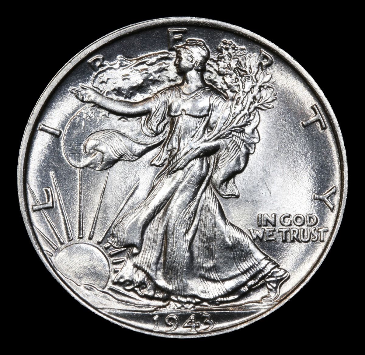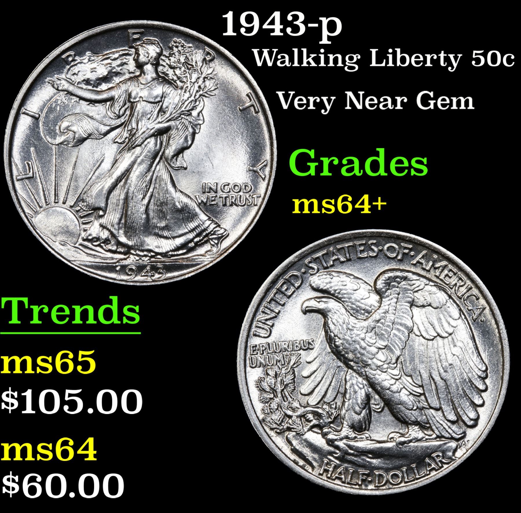 1943-p . Very Near Gem Walking Liberty Half Dollar 50c Grades Choice+ Unc.