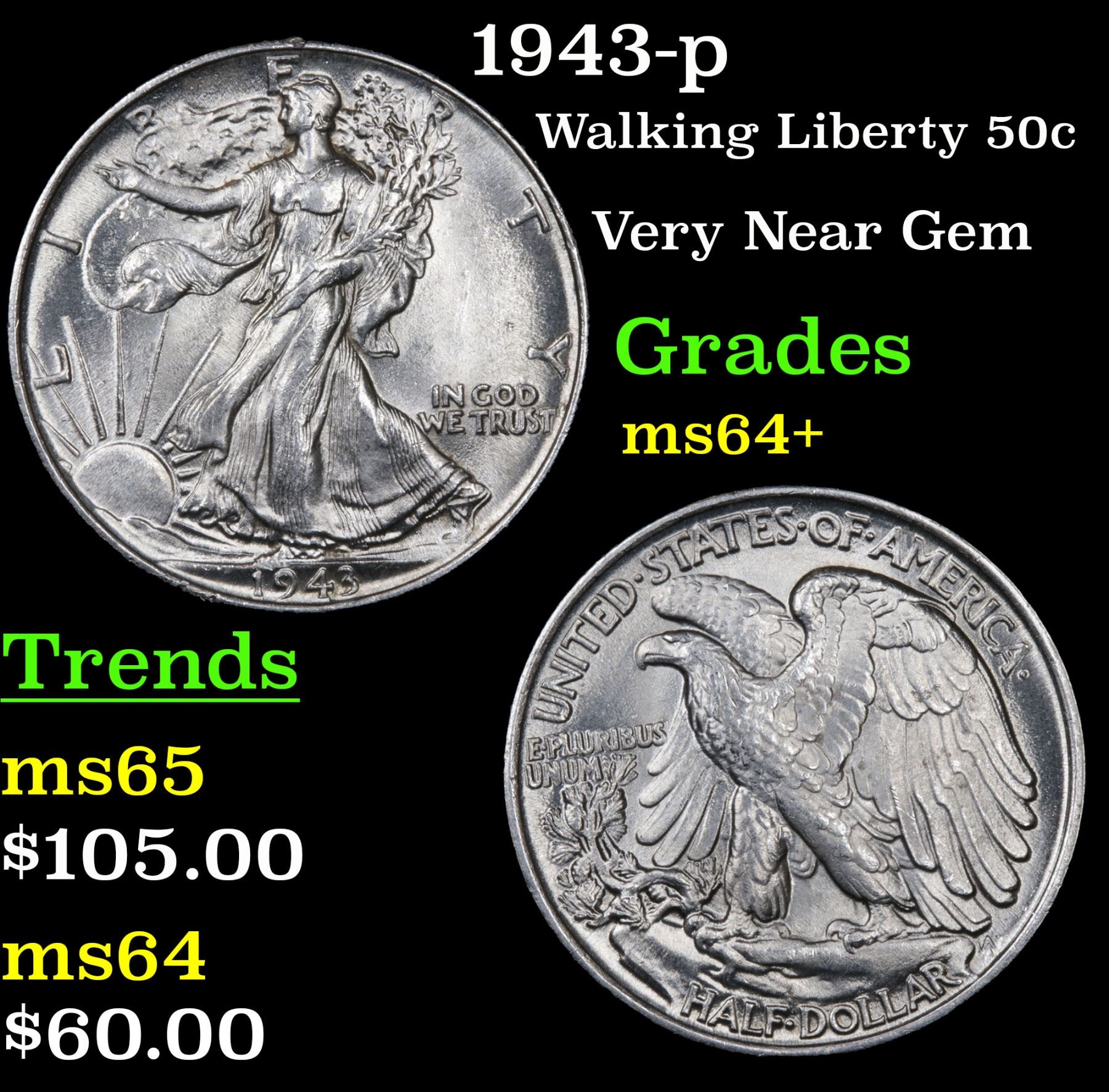 1943-p Walking Liberty Half Dollar 50c Grades Choice+ Unc.