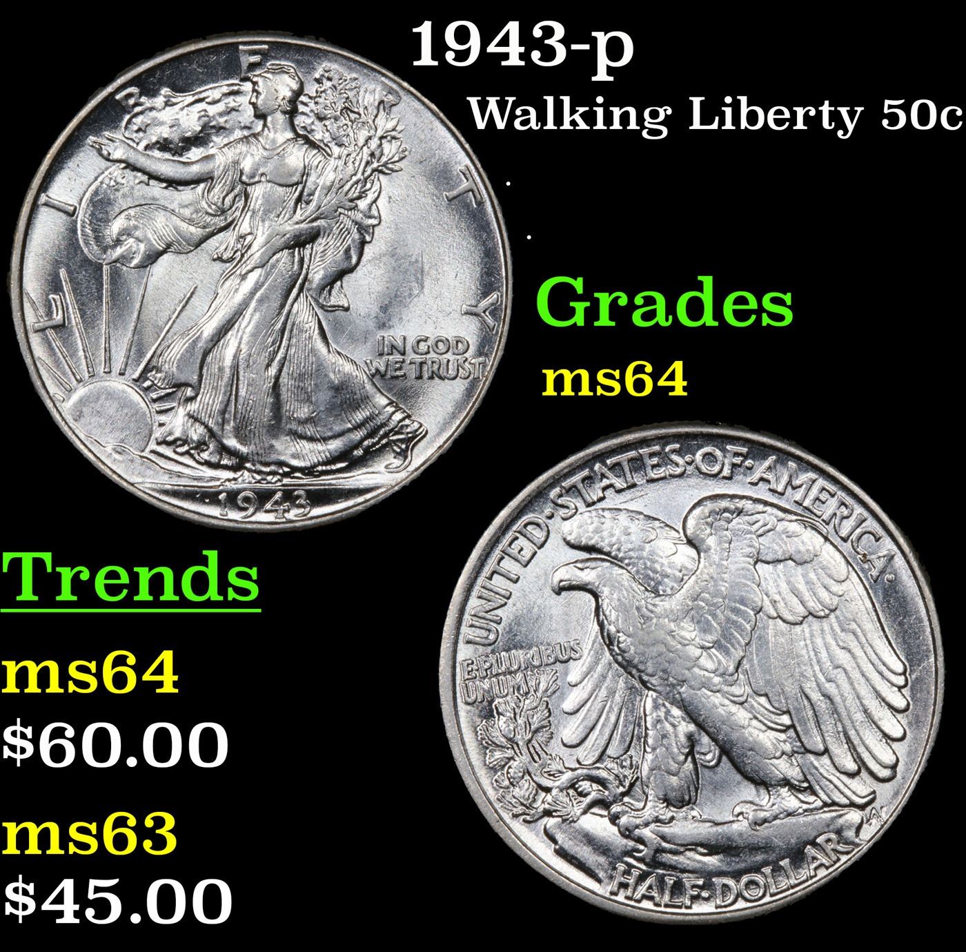 1943-p Walking Liberty Half Dollar 50c Grades Choice Unc.