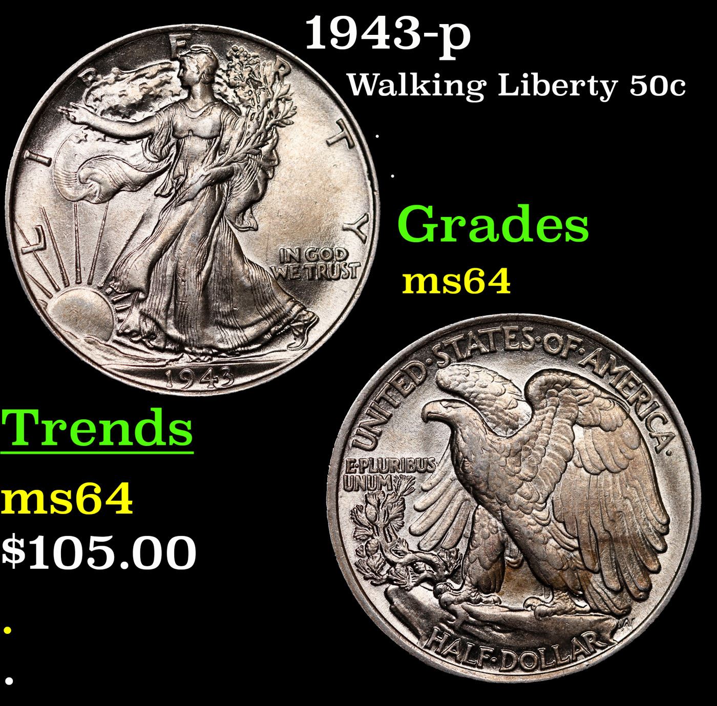 1943-p Walking Liberty Half Dollar 50c Grades Choice Unc.