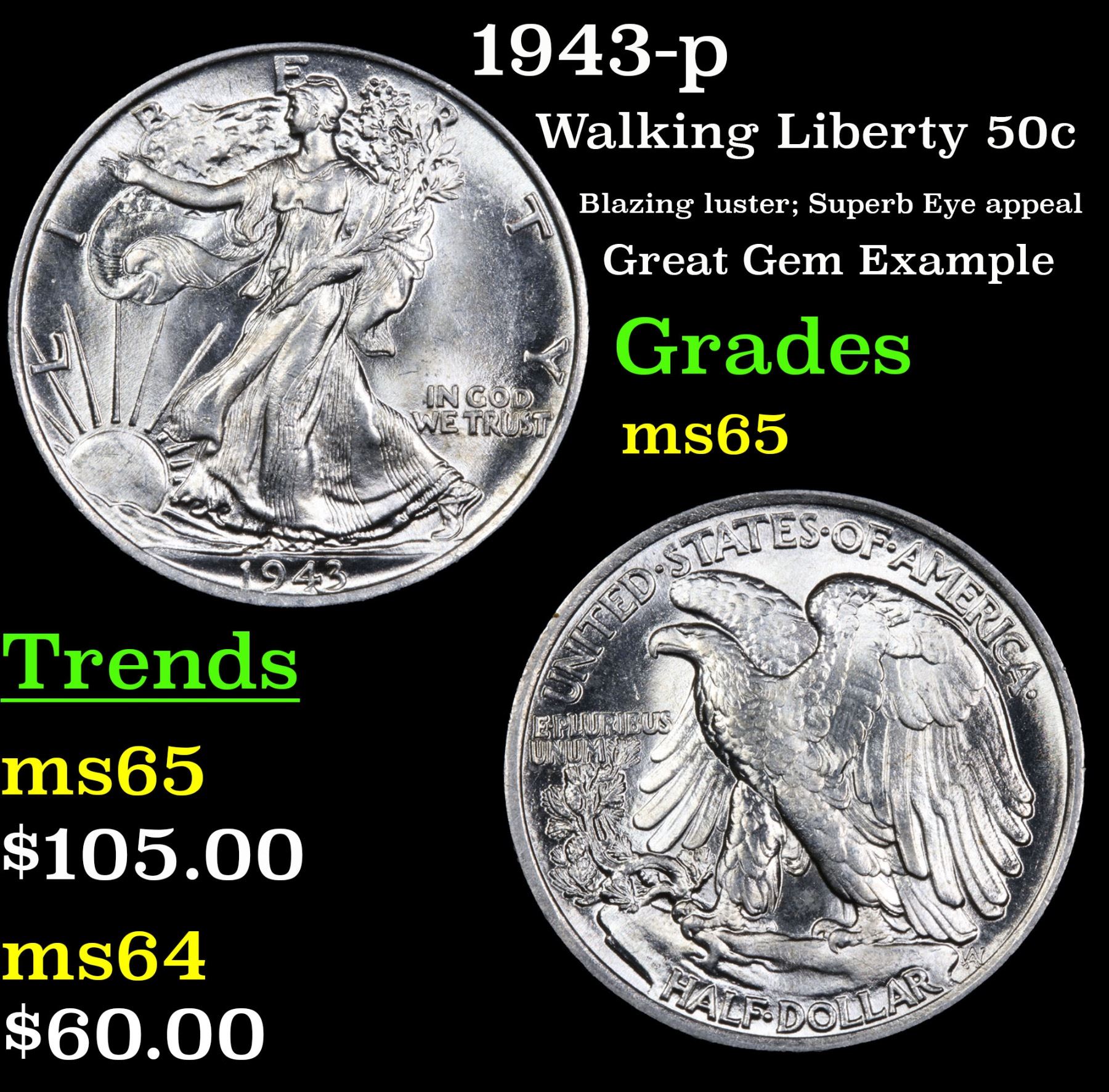 1943-p Walking Liberty Half Dollar 50c Grades GEM Unc.