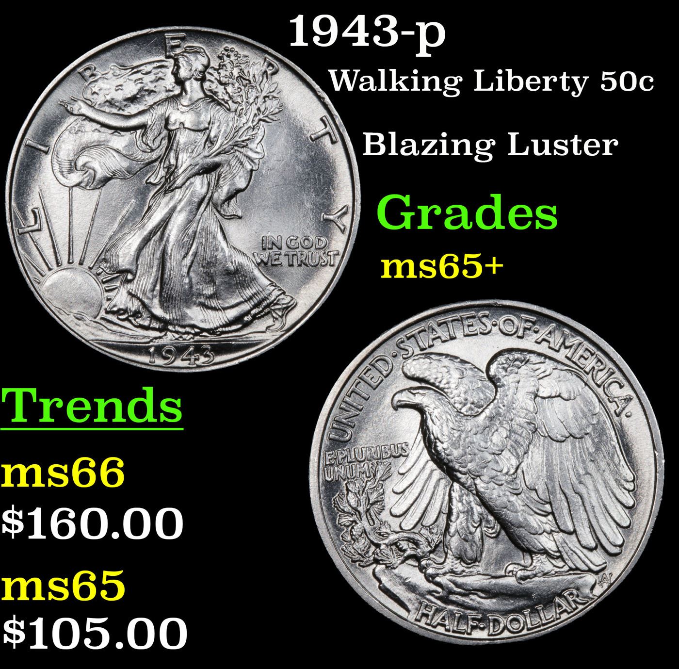 1943-p Walking Liberty Half Dollar 50c Grades GEM+ Unc.