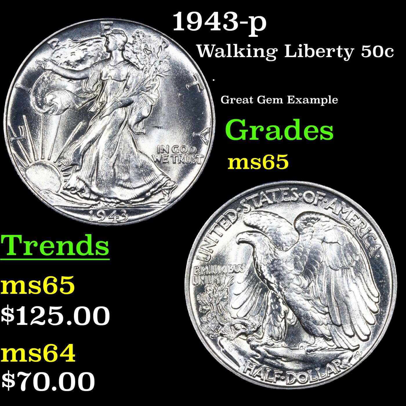 1943-p Walking Liberty Half Dollar 50c Grades GEM Unc.