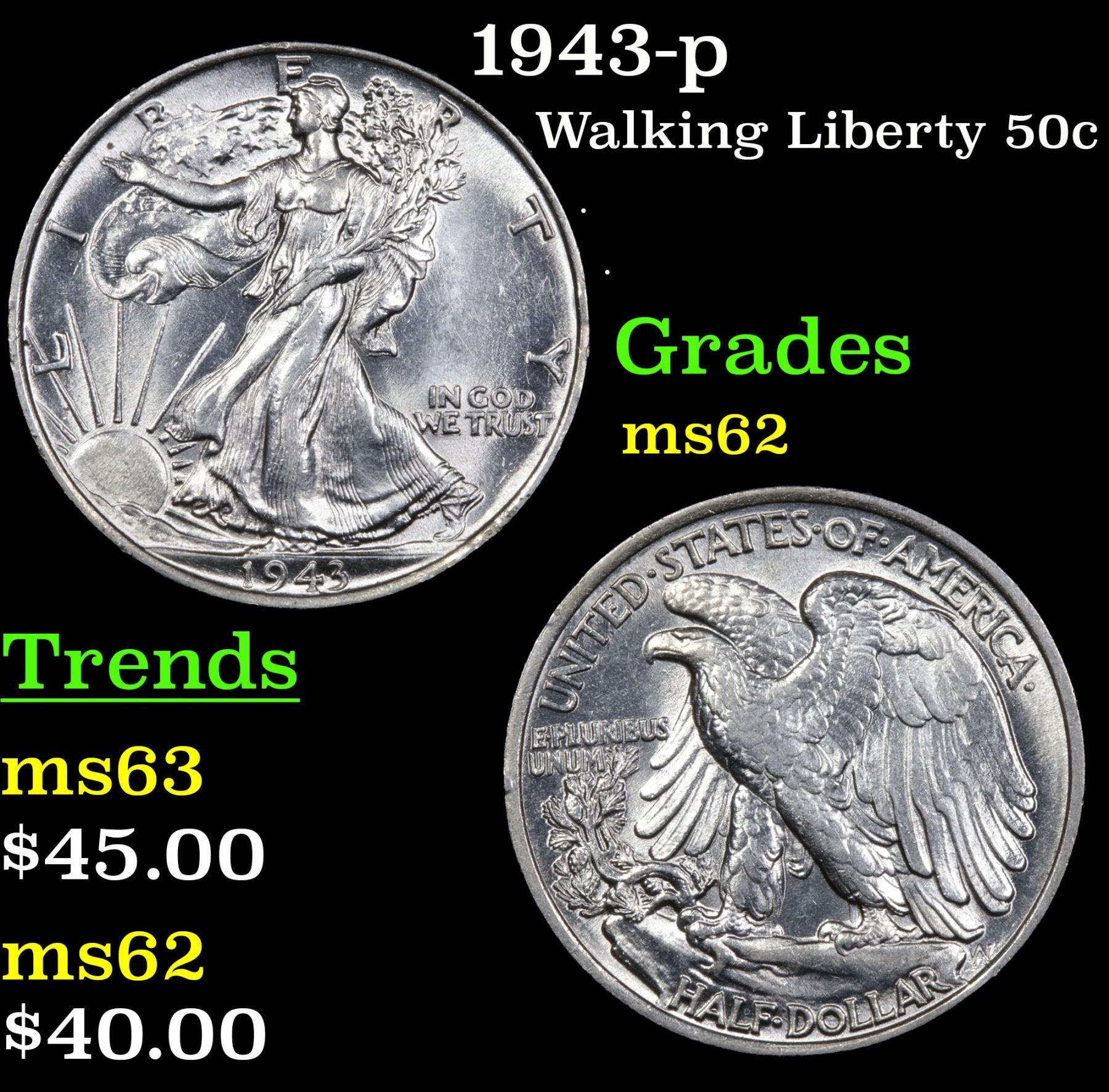 1943-p Walking Liberty Half Dollar 50c Grades Select Unc.