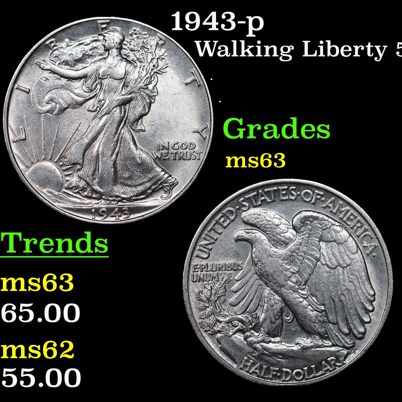 1943-p Walking Liberty Half Dollar 50c Grades Select Unc.