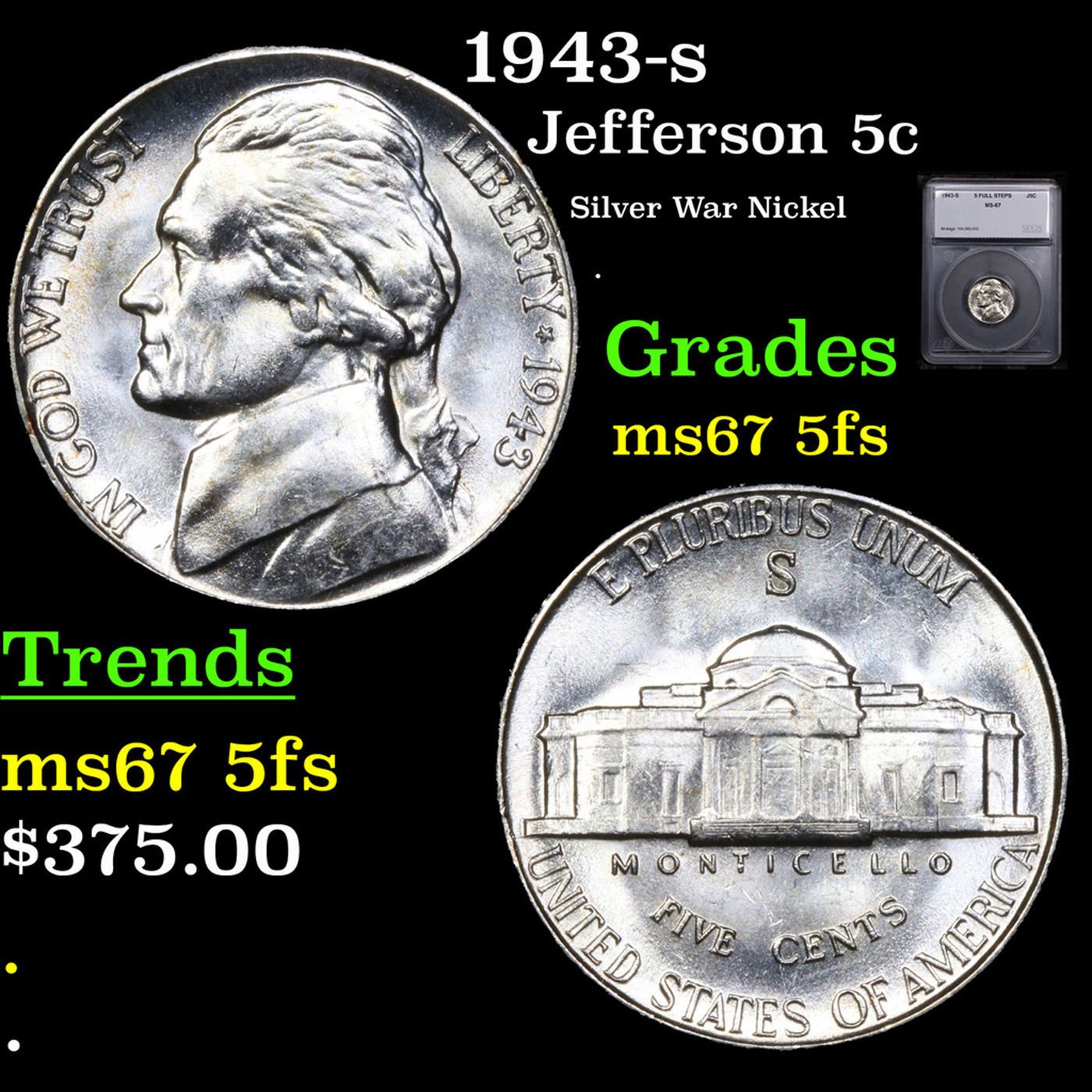1943-s Jefferson Nickel 5c Graded ms67 5fs BY SEGS.