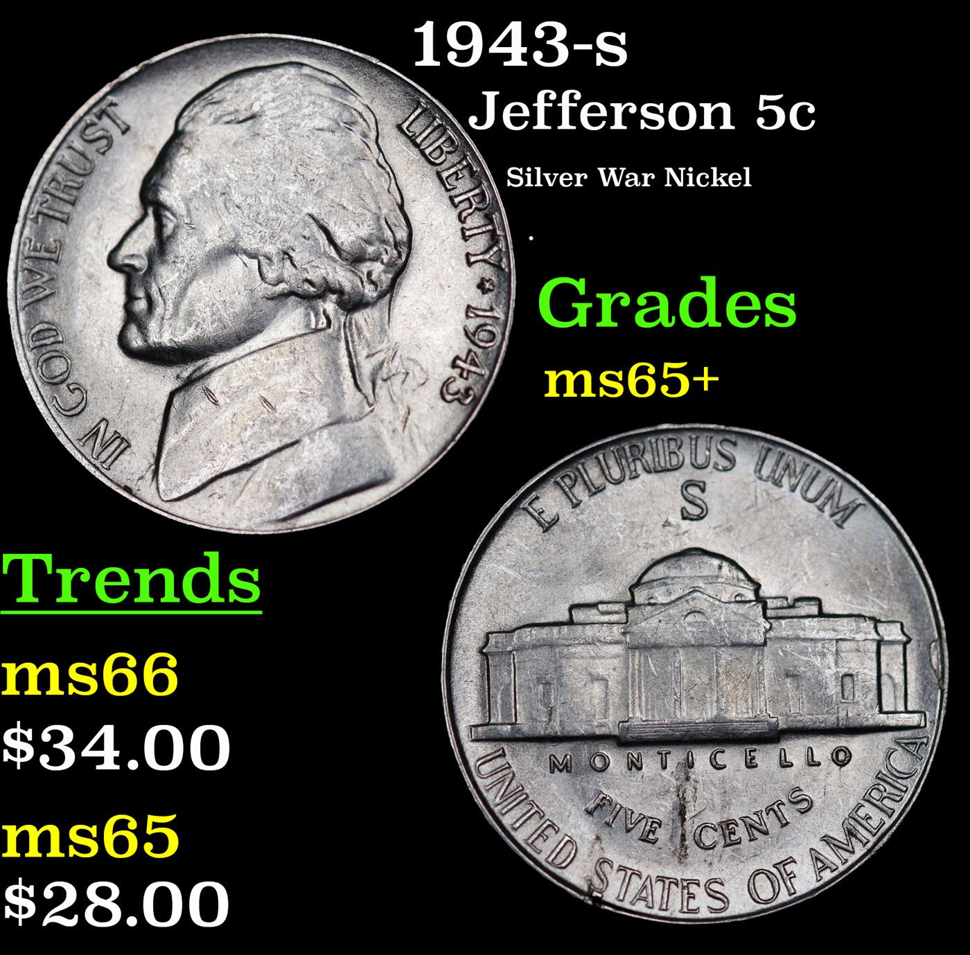 1943-s Jefferson Nickel 5c Grades GEM+ Unc.