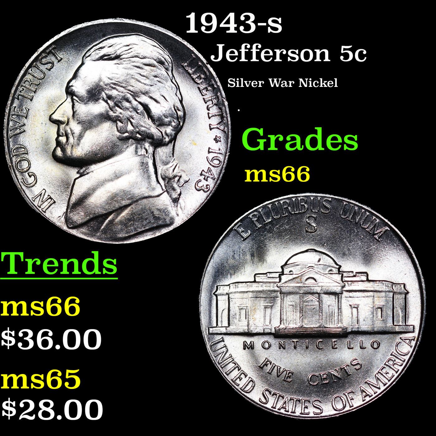 1943-s Jefferson Nickel 5c Grades GEM+ Unc.