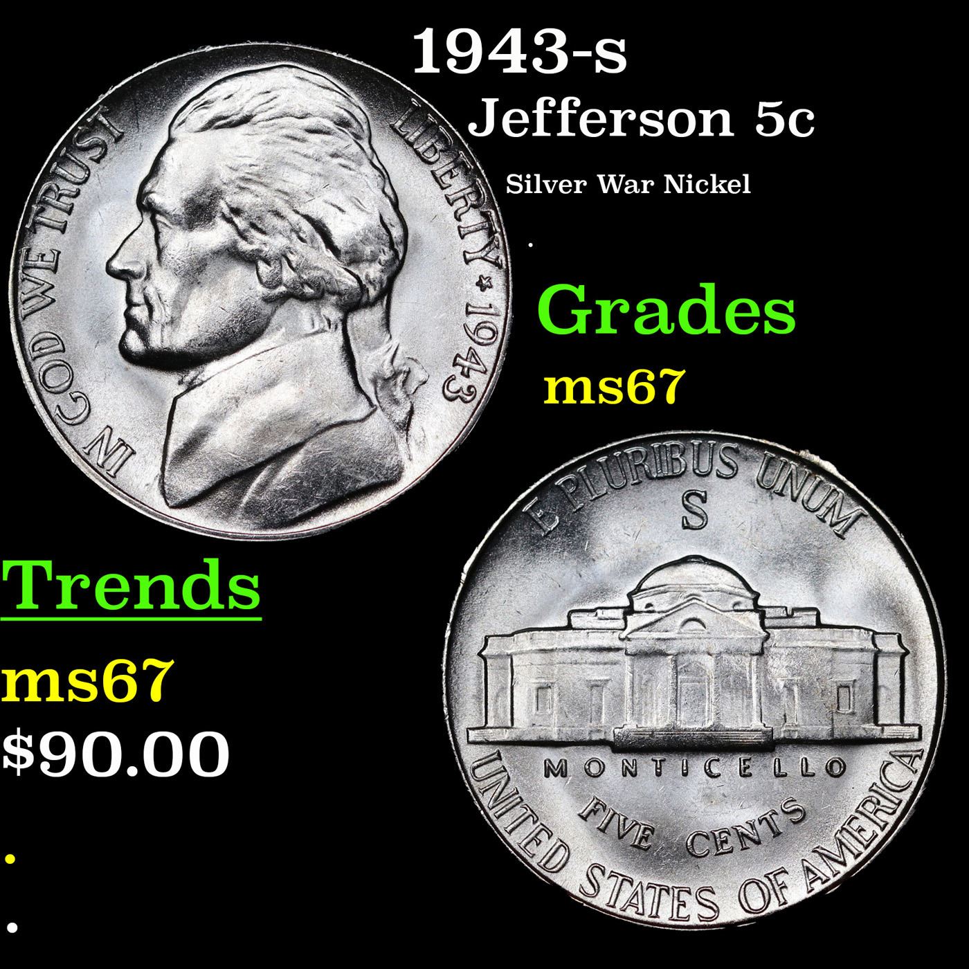 1943-s Jefferson Nickel 5c Grades GEM++ Unc.