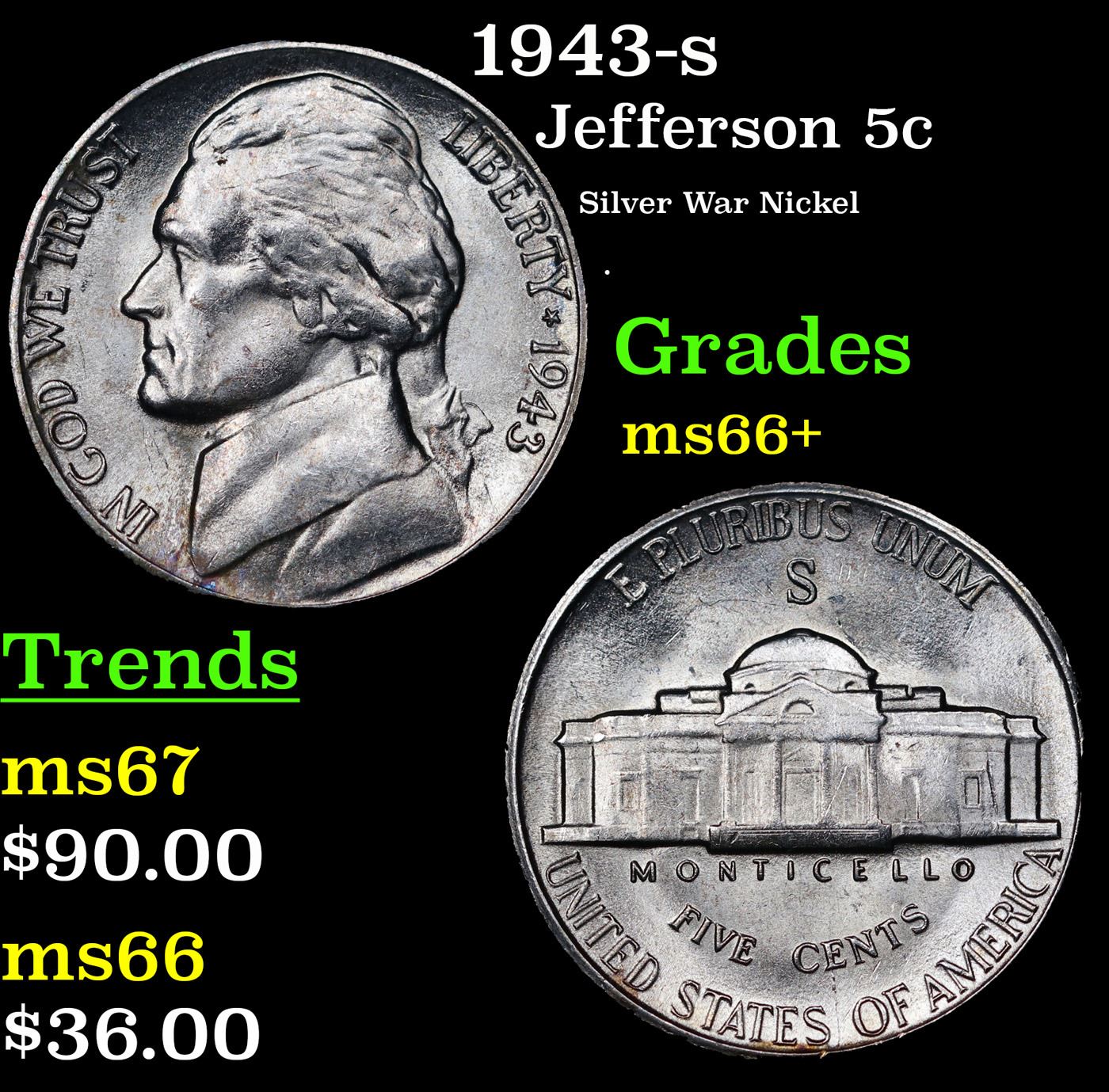 1943-s Jefferson Nickel 5c Grades GEM++ Unc.