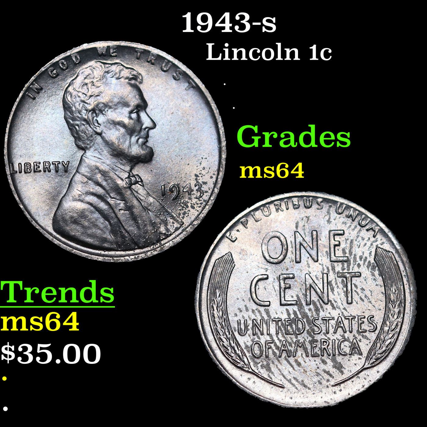 1943-s Lincoln Cent 1c Grades Choice Unc. One year type coin. The much heralded, "Steel" WWII cent. Great example of a favorite coin. The 1943-s Wartime issue Steel Cent. The s mint is the scarcest of the 3.