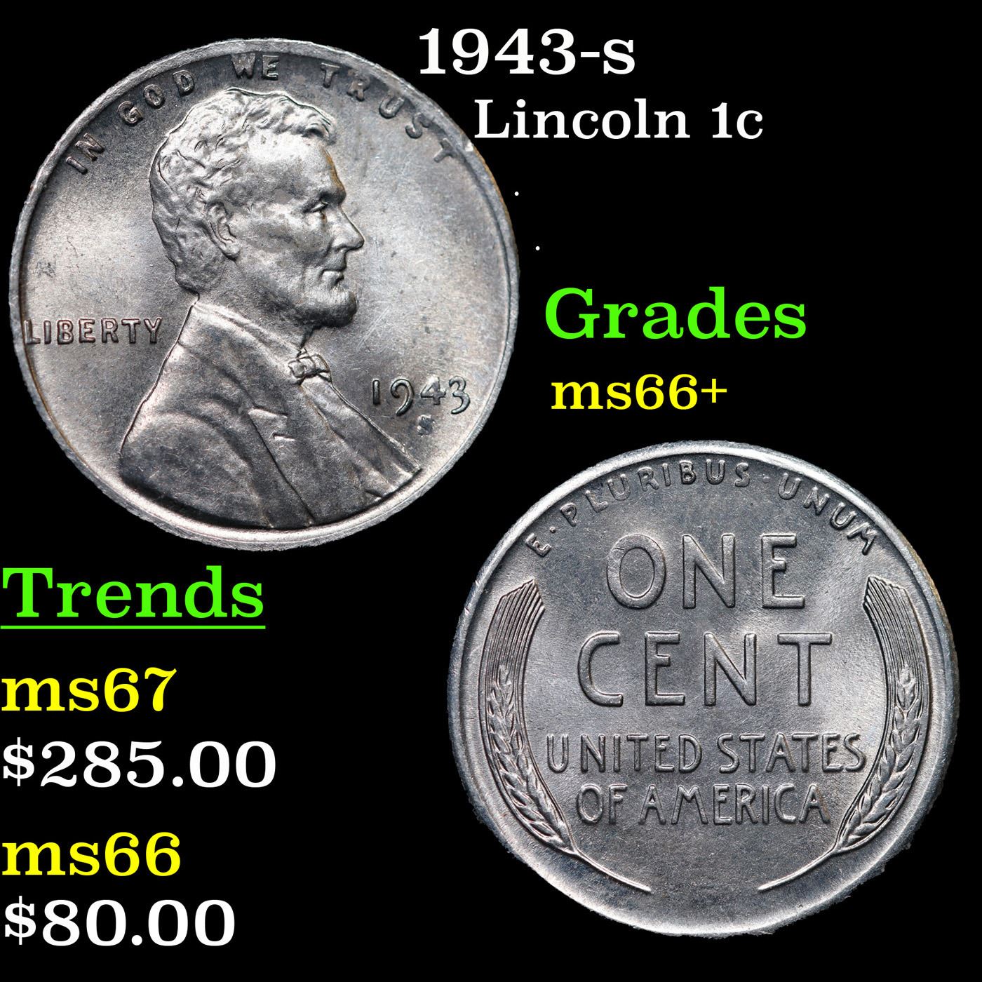 1943-s Lincoln Cent 1c Grades GEM++ Unc. One year type coin. The much heralded, "Steel" WWII cent. Great example of a favorite coin. The 1943-s Wartime issue Steel Cent. The s mint is the scarcest of the 3.