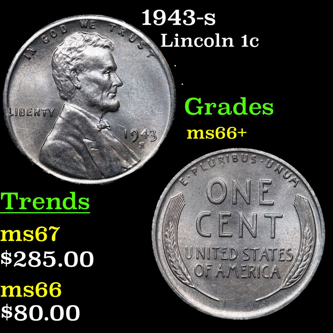 1943-s Lincoln Cent 1c Grades GEM++ Unc. One year type coin. The much heralded, "Steel" WWII cent. Great example of a favorite coin. The 1943-s Wartime issue Steel Cent. The s mint is the scarcest of the 3.
