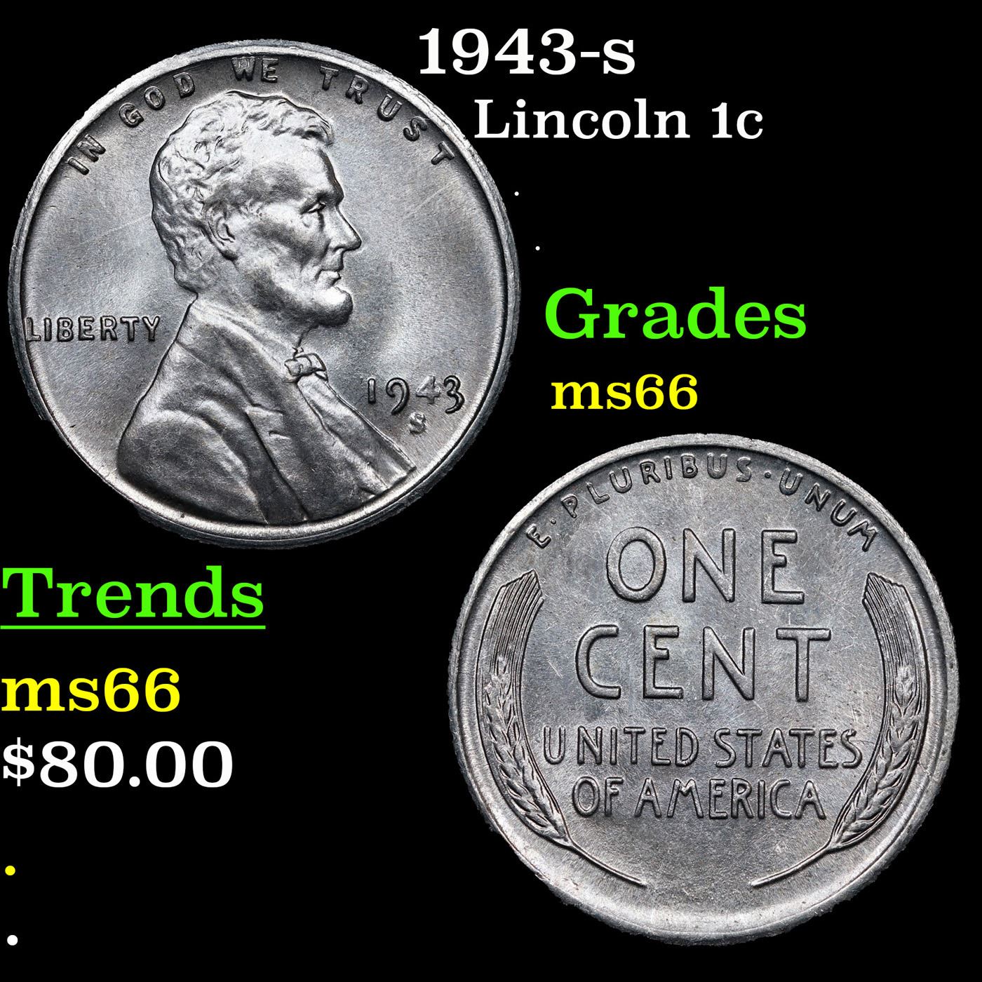 1943-s Lincoln Cent 1c Grades GEM+ Unc. One year type coin. The much heralded, "Steel" WWII cent. Great example of a favorite coin. The 1943-s Wartime issue Steel Cent. The s mint is the scarcest of the 3.