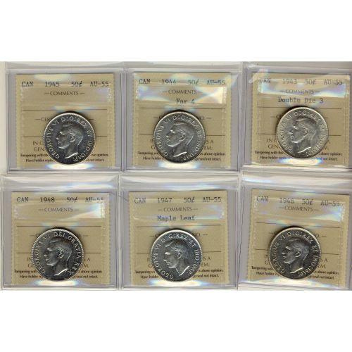 1943 to 1948 50¢. Lot of 6 coins, consecutive dates, all ICCS AU55. 1943 is Dbl Die 3, 1944 Far 4 and 1947 ML.
