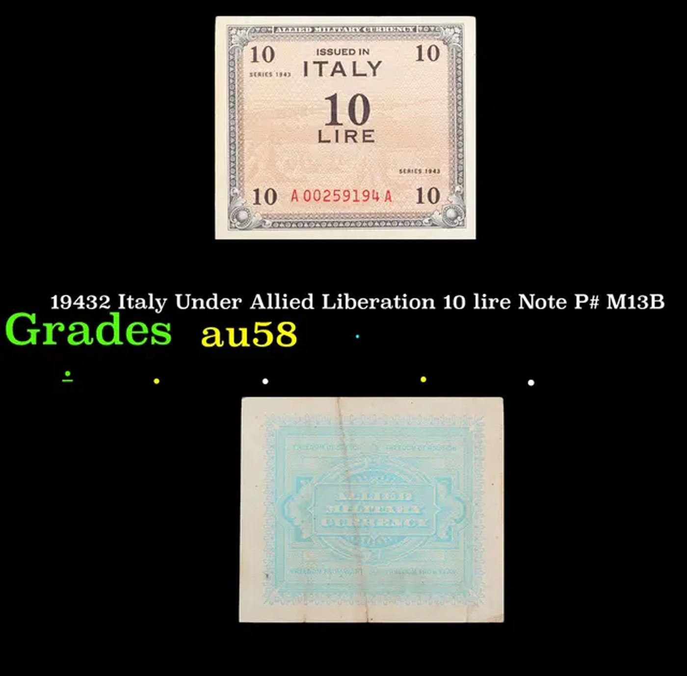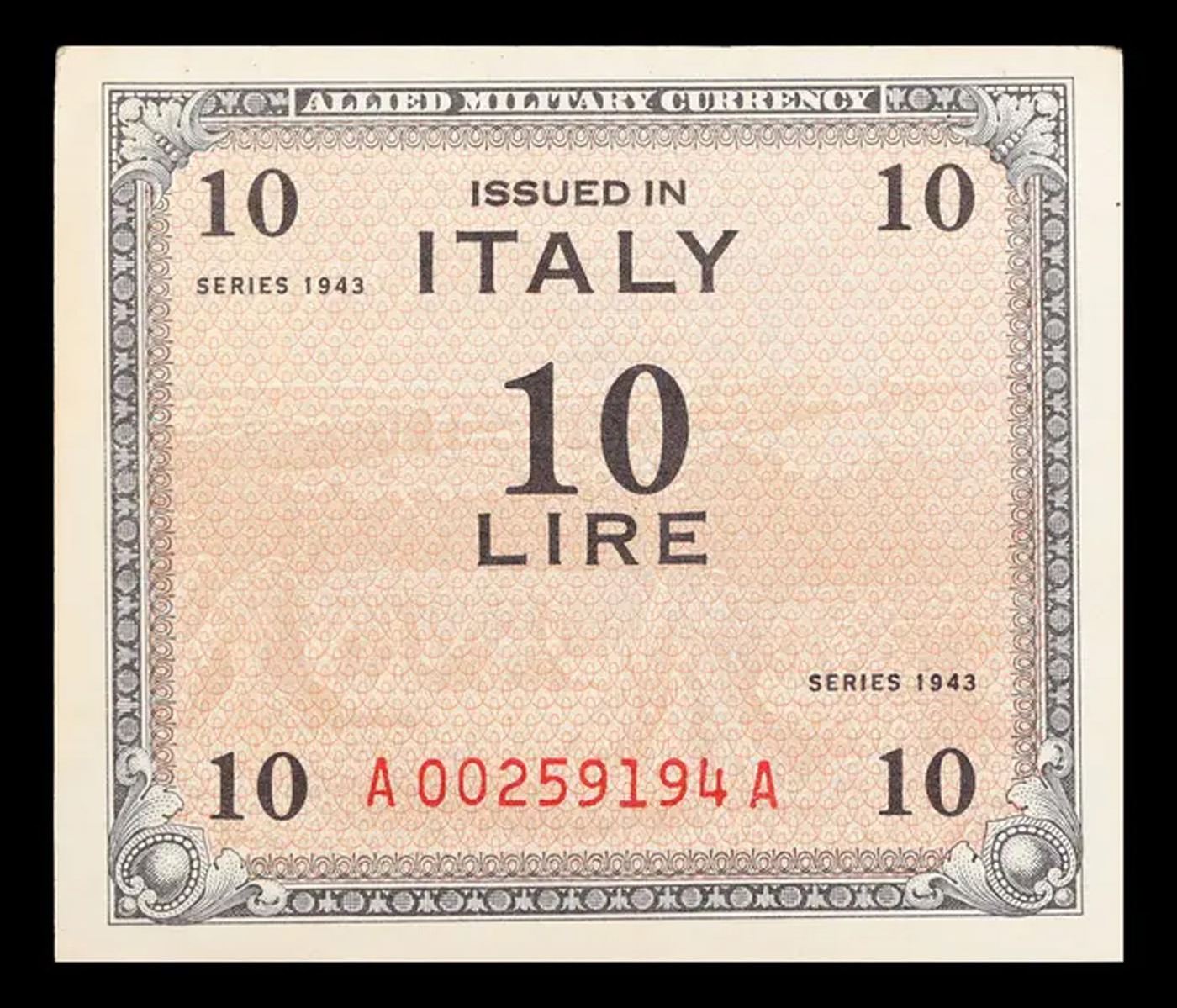 19432 Italy Under Allied Liberation 10 lire Note P# M13B Grades Choice AU/BU Slider. The AM-lira was the currency issued in Italy by Allied Military Government for Occupied Territories (AMGOT) after the Allied invasion of Sicily in 1943. 100 AM-lire were worth 1 US dollar, and there were two issues: 1943 and 1943A. Totally interchangeable with the normal Italian lira for military decision, it contributed to high inflation that hit Italy towards the end of World War II. Due to rampant inflation, Italy ultimately did not reissue the banknotes for 1 and 2 lire, which had since become useless. After 1946, the AM-lira ceased to be the sole currency and were used along with normal notes, until June 3, 1950.