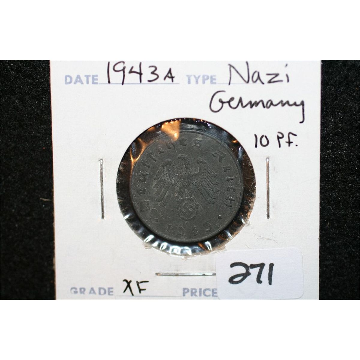 1943A Nazi Germany 10 Reichspfennig Foreign Coin, XF, Flying Eagle w/Swatstika
