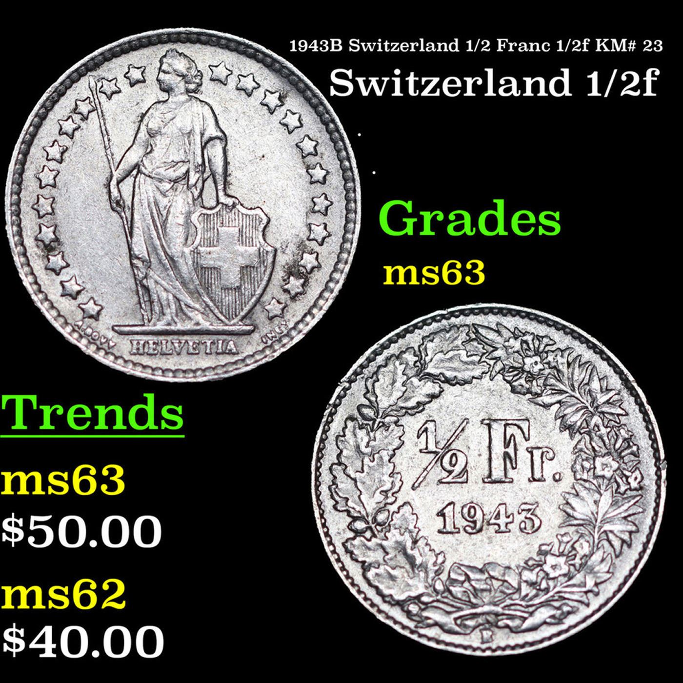 1943B Switzerland 1/2 Franc 1/2f KM# 23 Grades Select Unc.