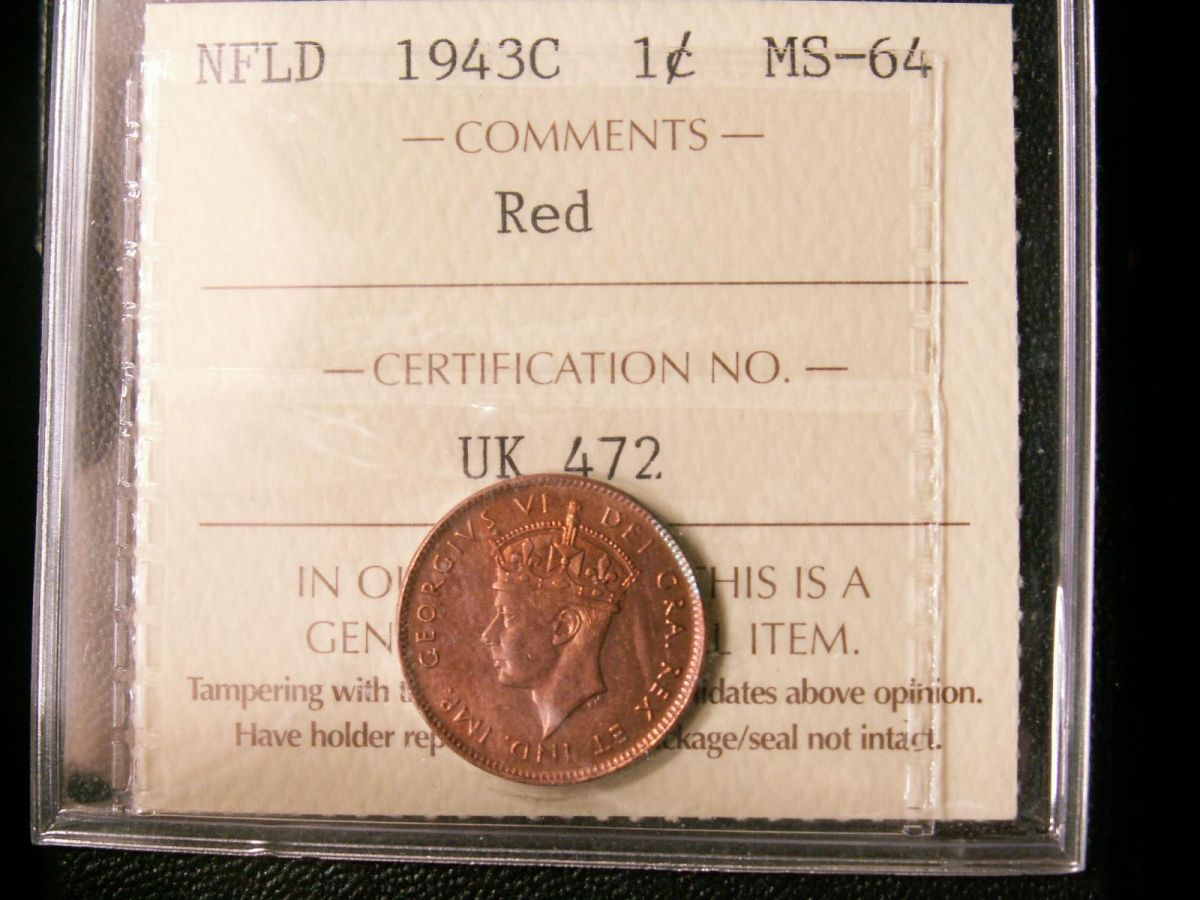 1943c Nfld 1¢ ICCS MS64RD. Flashy and 70% red.
