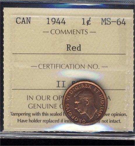 1944 1¢ ICCS MS64 Red. 95% full wine /red lustre. A nice example.