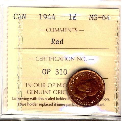 1944 1¢ ICCS MS64RD. Nice wine red finish.