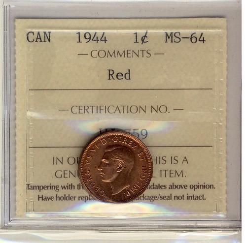 1944 1¢ ICCS MS64RD. Tough example in this grade. Coin is Red and not the typical wine red colour.