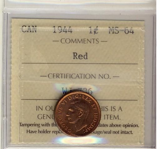 1944 1¢ ICCS MS64RD.  Tough example in this grade.  Coin is Red and not the typical wine red colour.