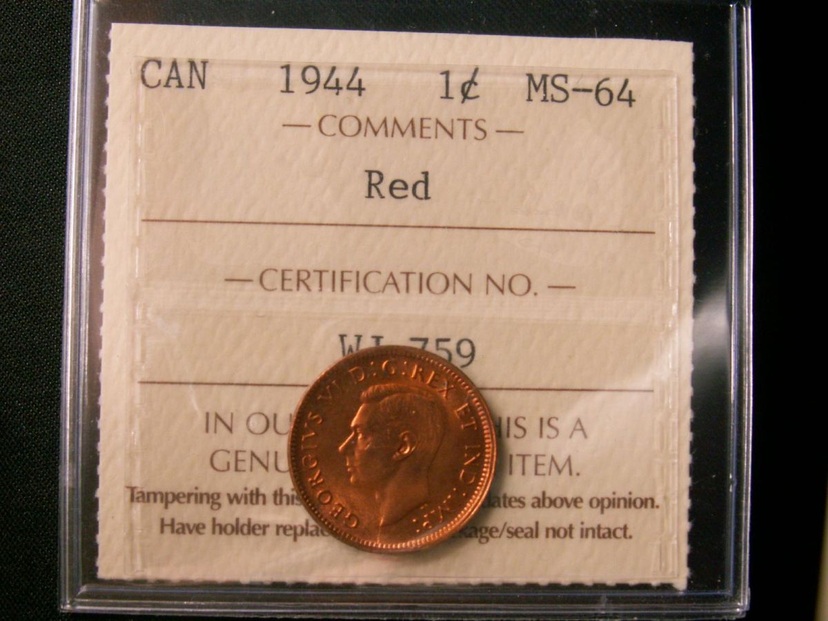 1944 1¢ ICCS MS64RD. Tough example in this grade. Coin is Red and not the typical wine red colour.