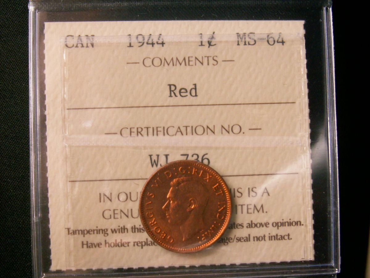 1944 1¢ ICCS MS64RD. Tough example in this grade. Coin is Red and not the typical wine red colour.