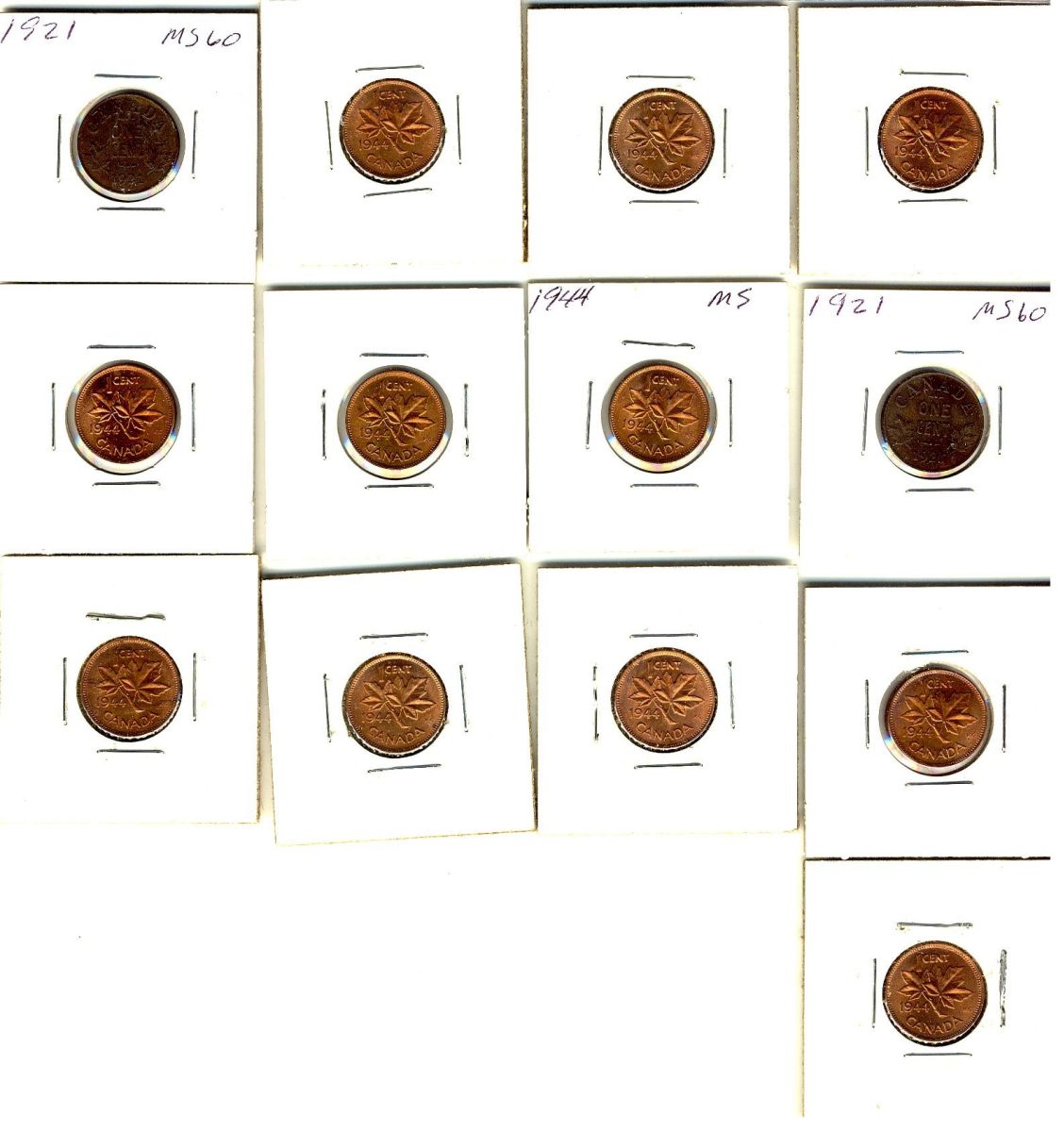 1944 1¢. Lot of eleven coins all BU63RD to BU64RD. Typical wine red colour. Lot also includes 2 x 1921 1¢ AU50 to UNC