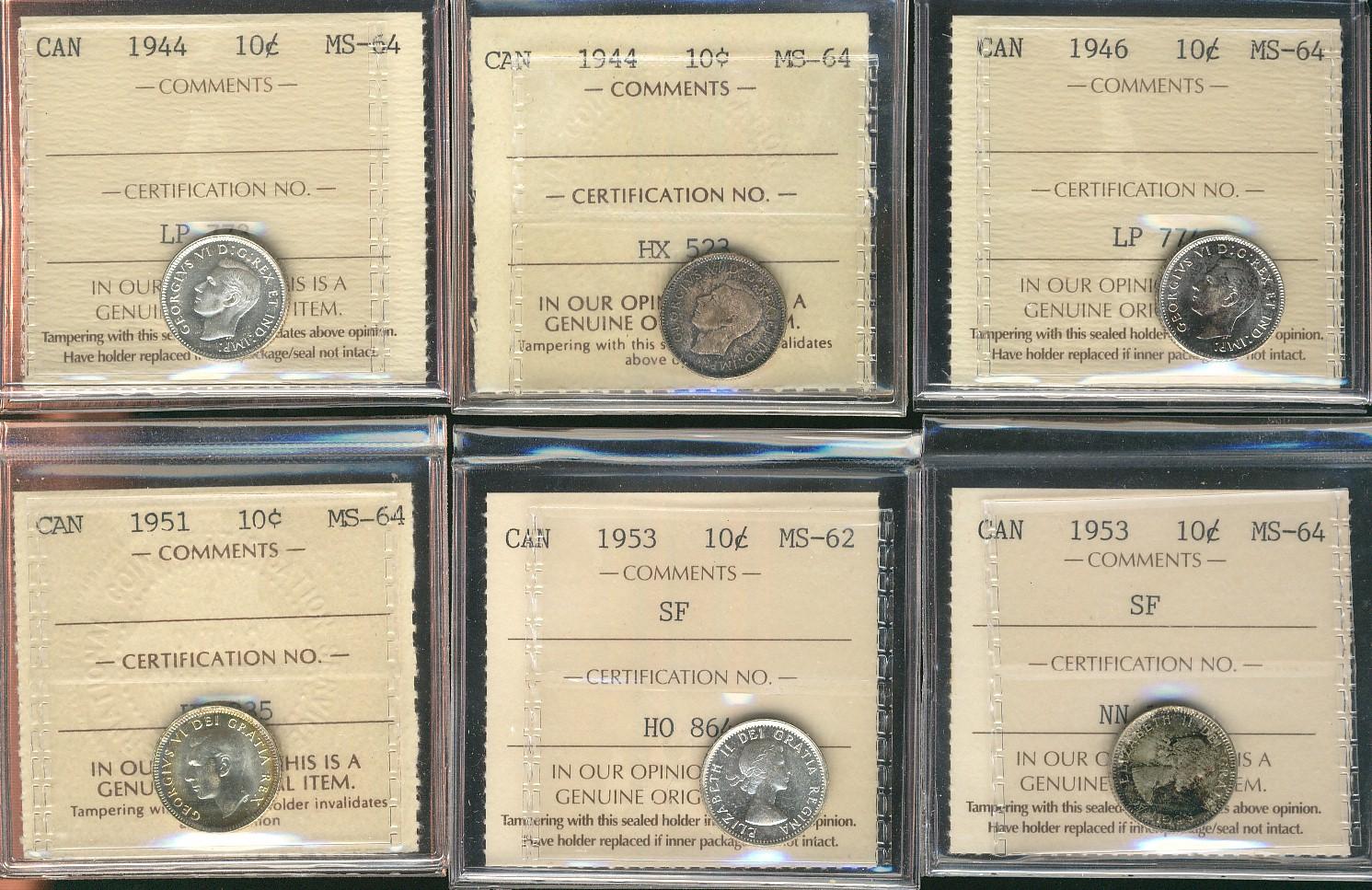 1944 10¢(2), 1946, 1951 & 1953 SF MS64. Lot of 6 coins all ICCS graded with one 1953 SF in MS62.