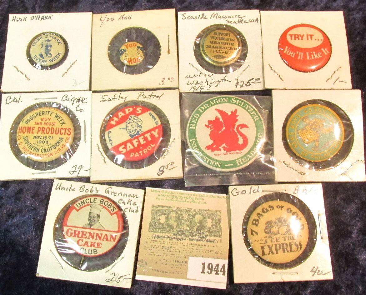 1944 _ (10) Different Old Pin-backs, which Doc had valued at over $100.00.