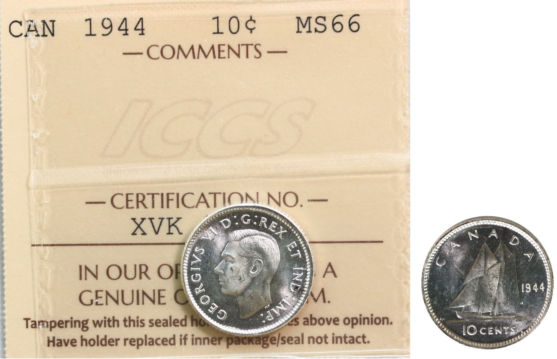 1944 10¢ ICCS Superb Gem Mint State-66 Blast white example. Flashy!