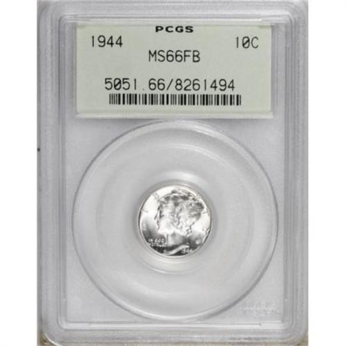<B>1944 10C MS66 Full Bands PCGS.</B></I> PCGS Population (407/68). NGC Census: (174/56). Mintage: 231,410,000. Numismedia Wsl. Price for NGC/PCGS coin in MS66: $120. (#5051)<BR><BR><B>Coin Engraver:</B> Adolph A. Weinman<BR><BR><b>Shipping:</b> Coins & Currency (<a target="_blank" href="http://www.heritageauctions.com/common/shipping.php">view shipping information</a>)