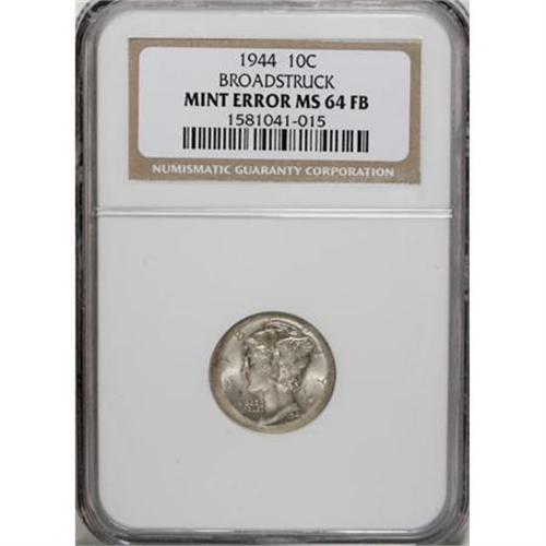 <B>1944 10C Mercury Dime--Broadstruck--MS64 Full Bands NGC.</B></I><BR><BR><B>Coin Engraver:</B> Adolph A. Weinman<BR><BR><b>Shipping:</b> Coins & Currency (<a target="_blank" href="http://www.heritageauctions.com/common/shipping.php">view shipping information</a>)