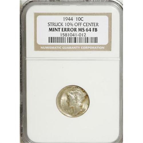 <B>1944 10C Mercury Dime--Struck 10% off center--MS64 Full Bands NGC.</B></I><BR><BR><B>Coin Engraver:</B> Adolph A. Weinman<BR><BR><b>Shipping:</b> Coins & Currency (<a target="_blank" href="http://www.heritageauctions.com/common/shipping.php">view shipping information</a>)